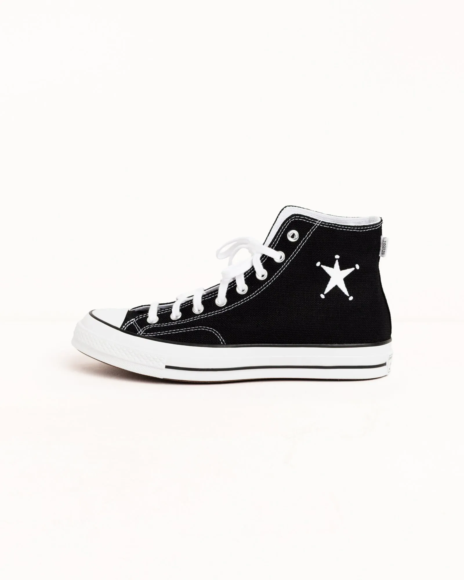 Stüssy & Converse Chuck 70 ハイカットスニーカー。ヘンプキャンバス素材を使用。側面にStüssyのスターアイコンが刺繍されています。大きめのサイズ感のため、普段のサイズよりハーフサイズ小さめをお選びください。