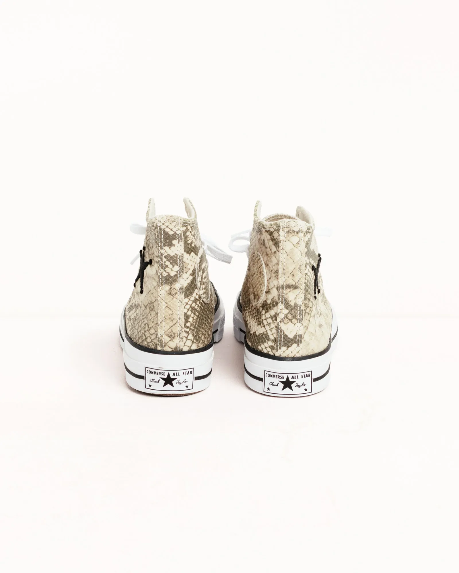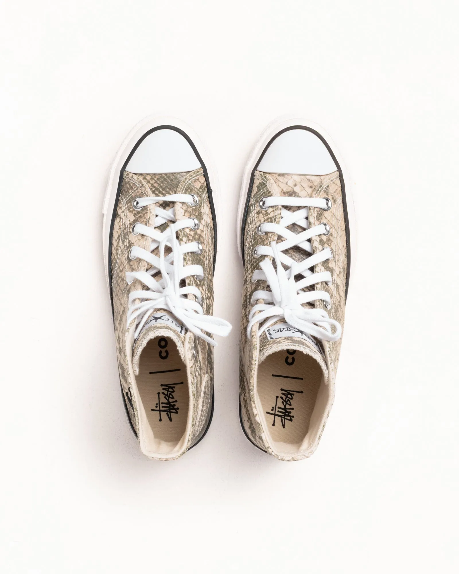 - Stüssy & Converse Chuck 70 ハイカットスニーカー。全体にスネークプリントのレザーを使用し、キャンバスライニングを使用。