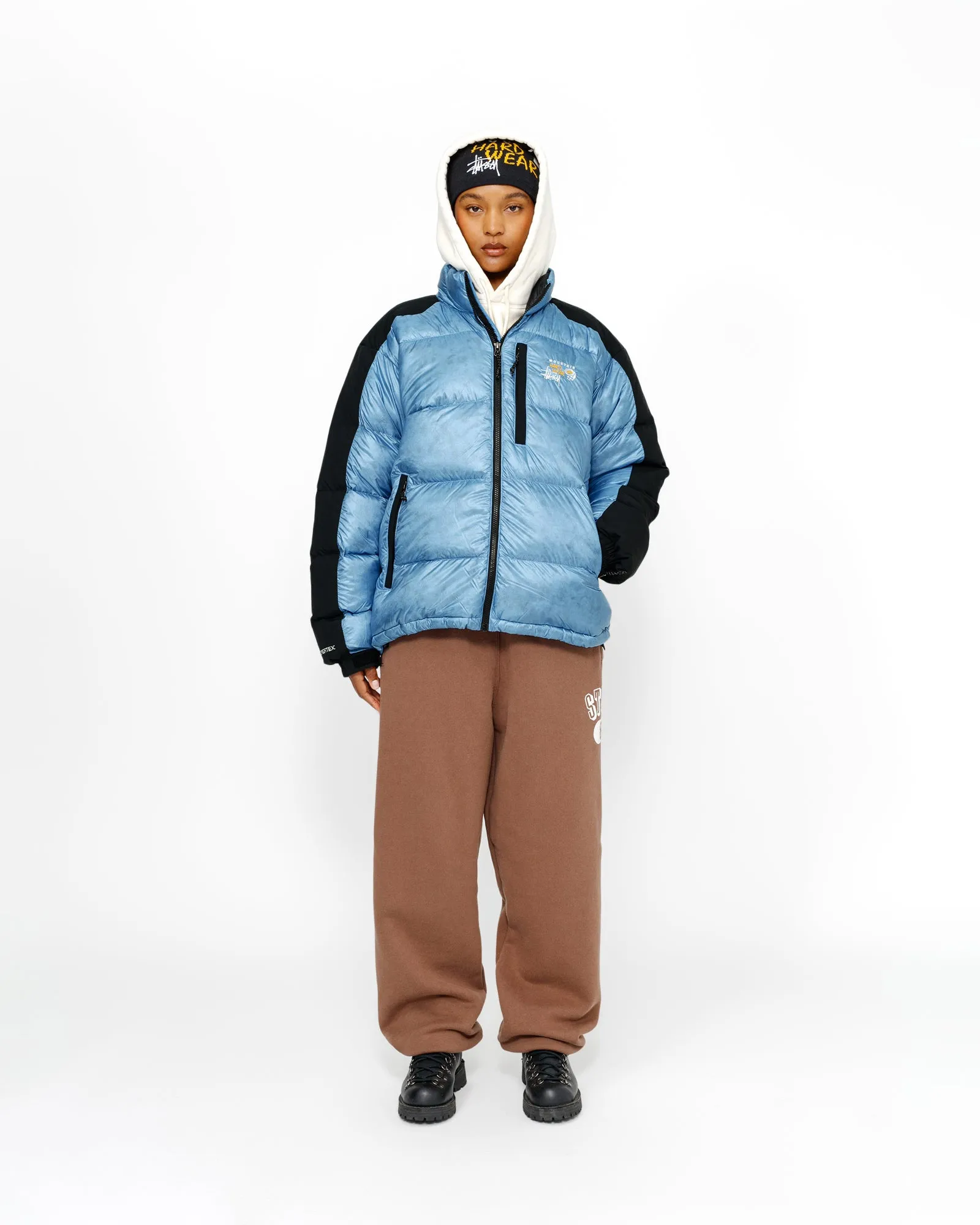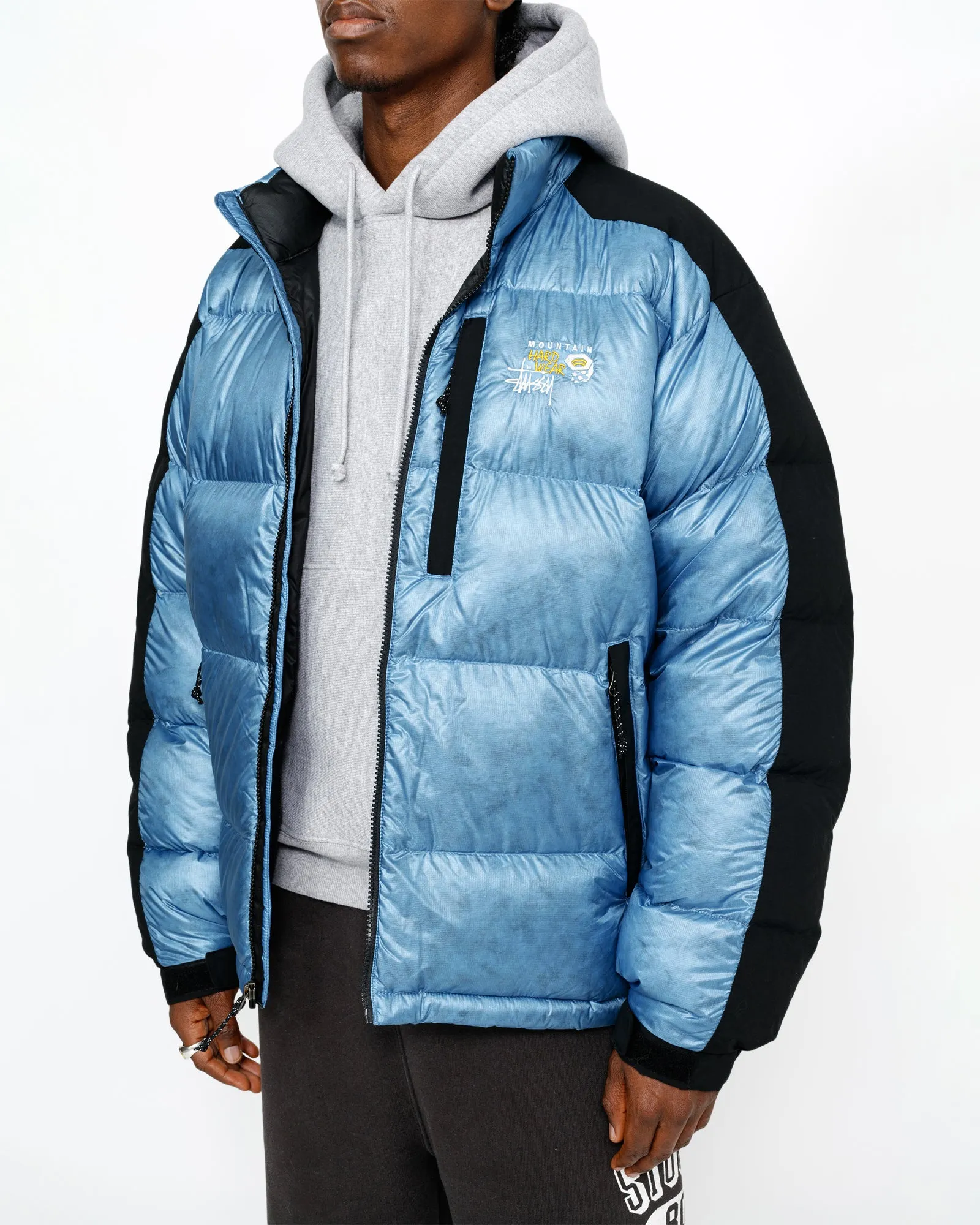 耐水加工を施したPertex® Quantum Y Fuse 30Dリップストップ素材を使用したSubzero™ダウンジャケット。保温性の高い650フィルパワー認証ダウンインサレーション、耐摩耗性と耐候性を高める耐久性のあるオーバーレイコーティング、そしてジッパー付きポケットを備えています。胸元にはStüssyとMountain Hardwearの共同ブランドロゴが刺繍されています。